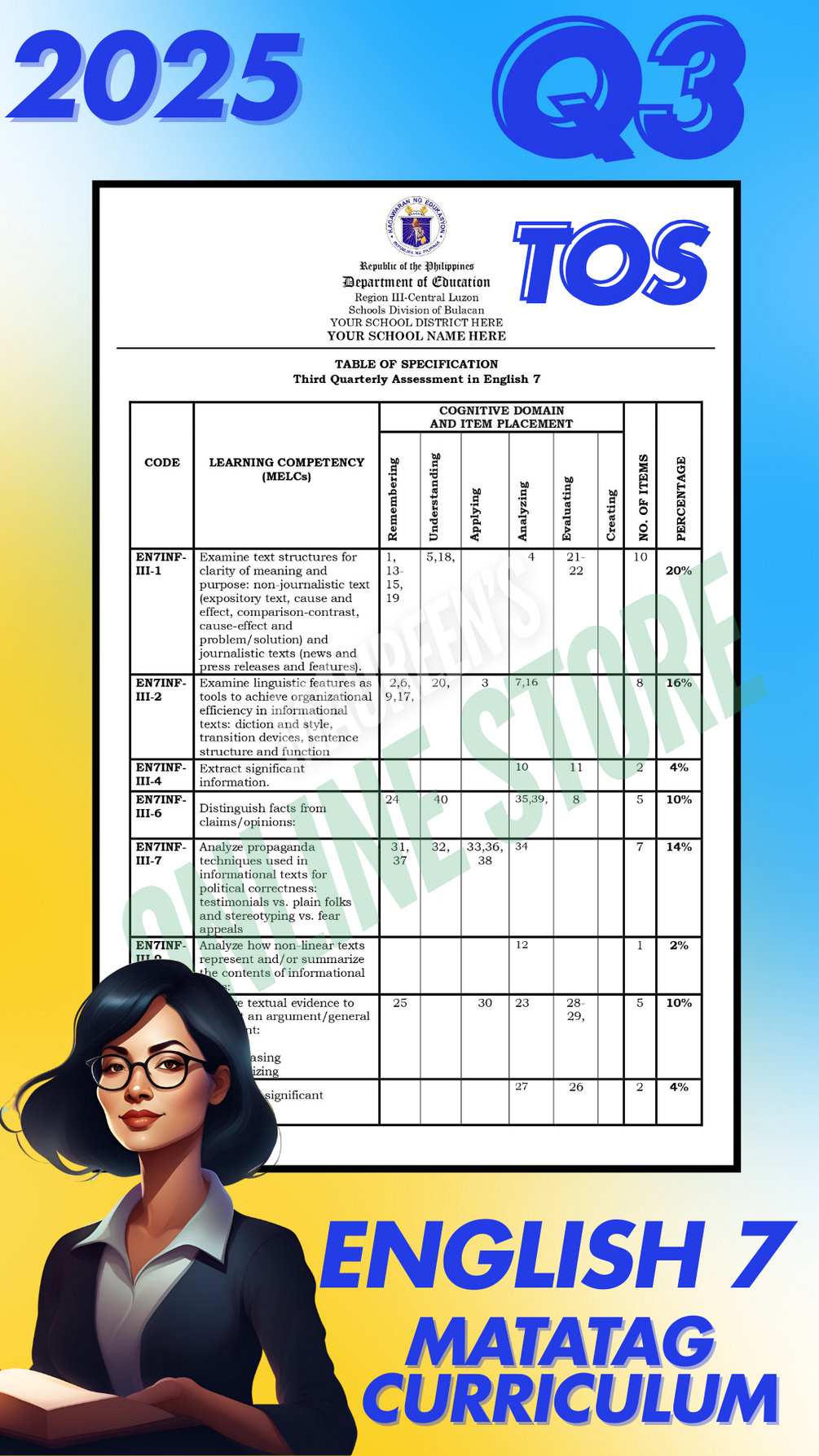 - 50-Item Test: Multiple choice (includes HOTS questions) - Table of Specifications: Aligned with the MATATAG Curriculum - Answer Key