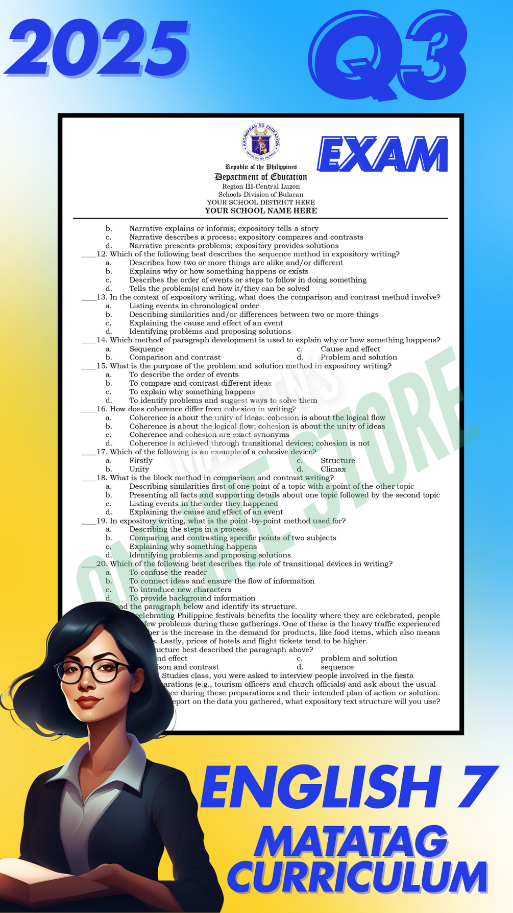 Simplify your exam preparation with our 3rd Quarterly Exam for English 7, crafted for the MATATAG Curriculum. This digital resource offers a straightforward way to assess your students while saving you time.